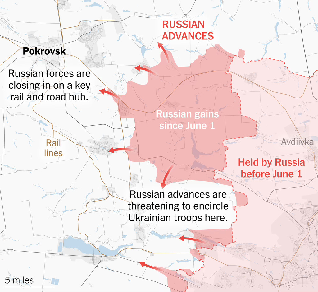 Meanwhile, Ukraine continues to lose more territory to Russian forces in the east, as this map (courtesy of the NYT) shows.