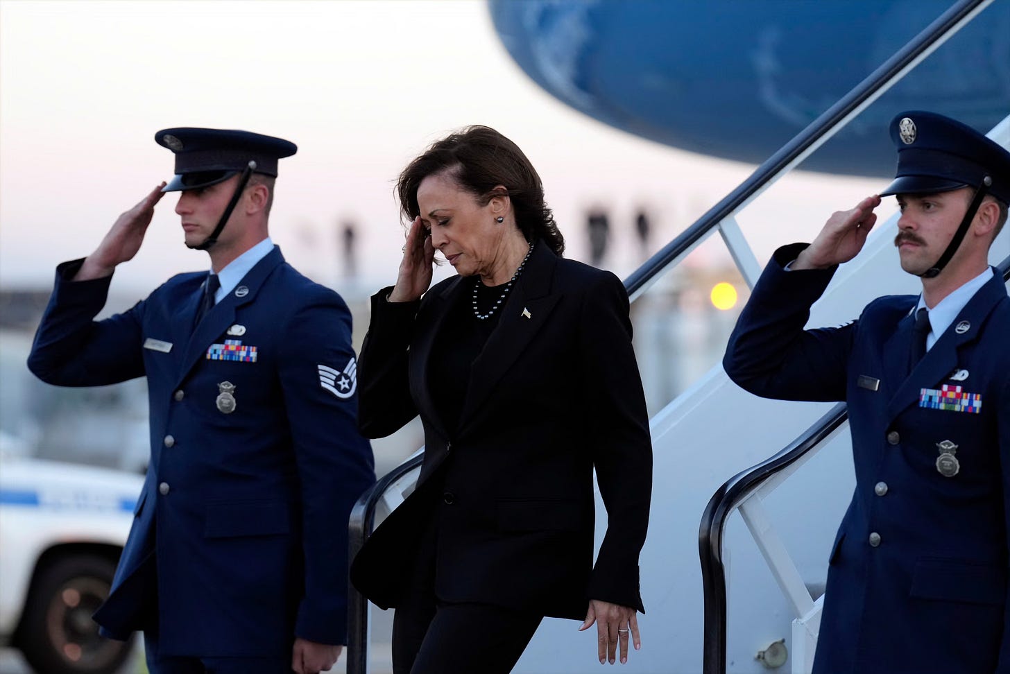 Here’s a photo of a saluting Kamala Harris wearing an obligatory flag pin that I saw today in the Guardian: