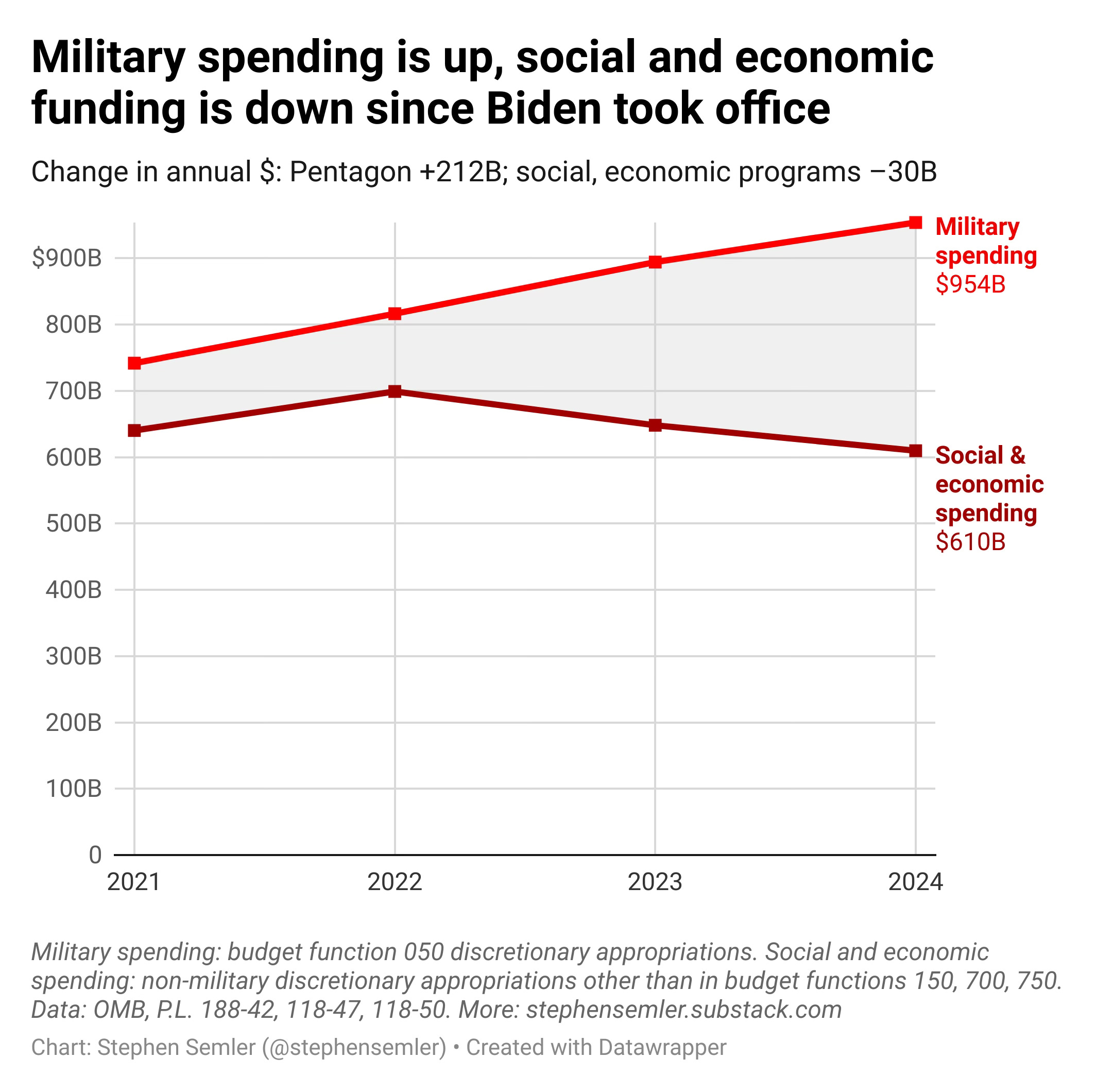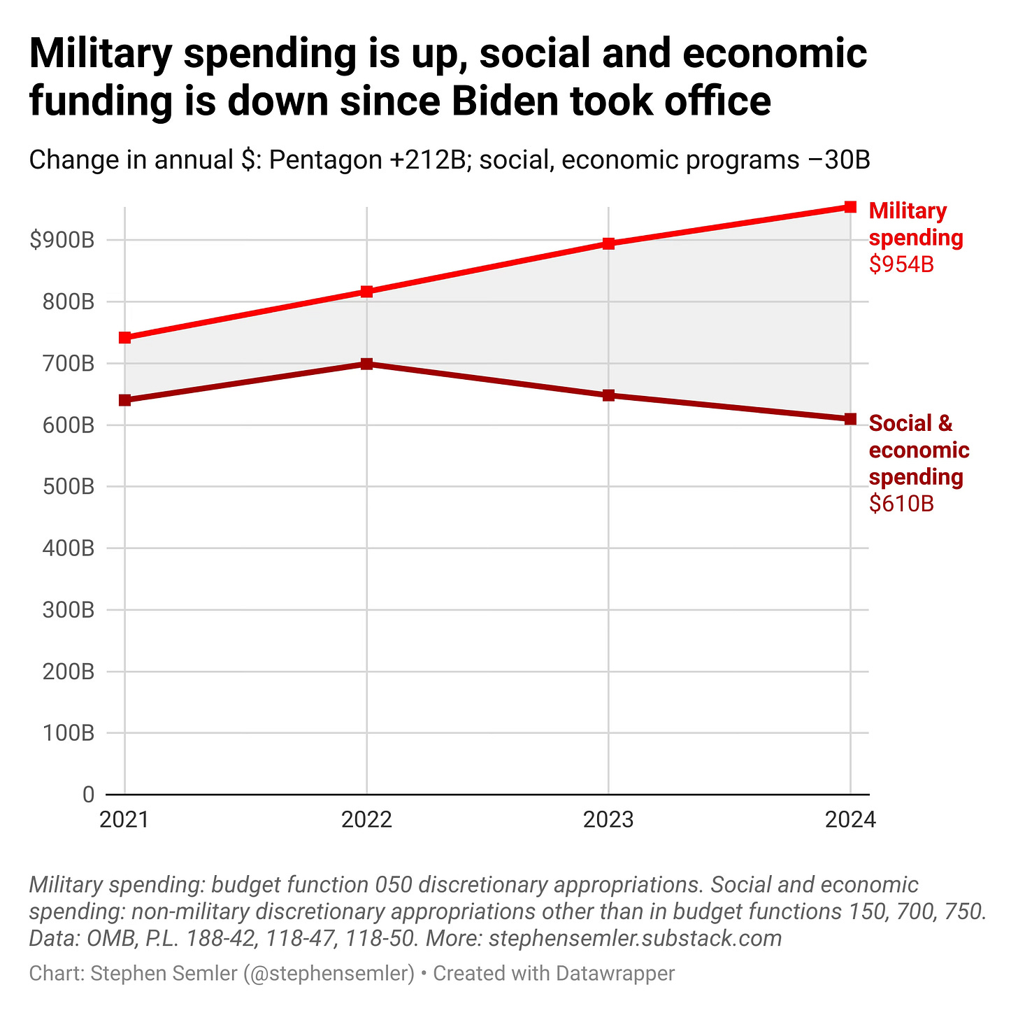 Let’s look at one chart that shows Biden’s record. Since he became President, military spending has soared as social spending has dipped.